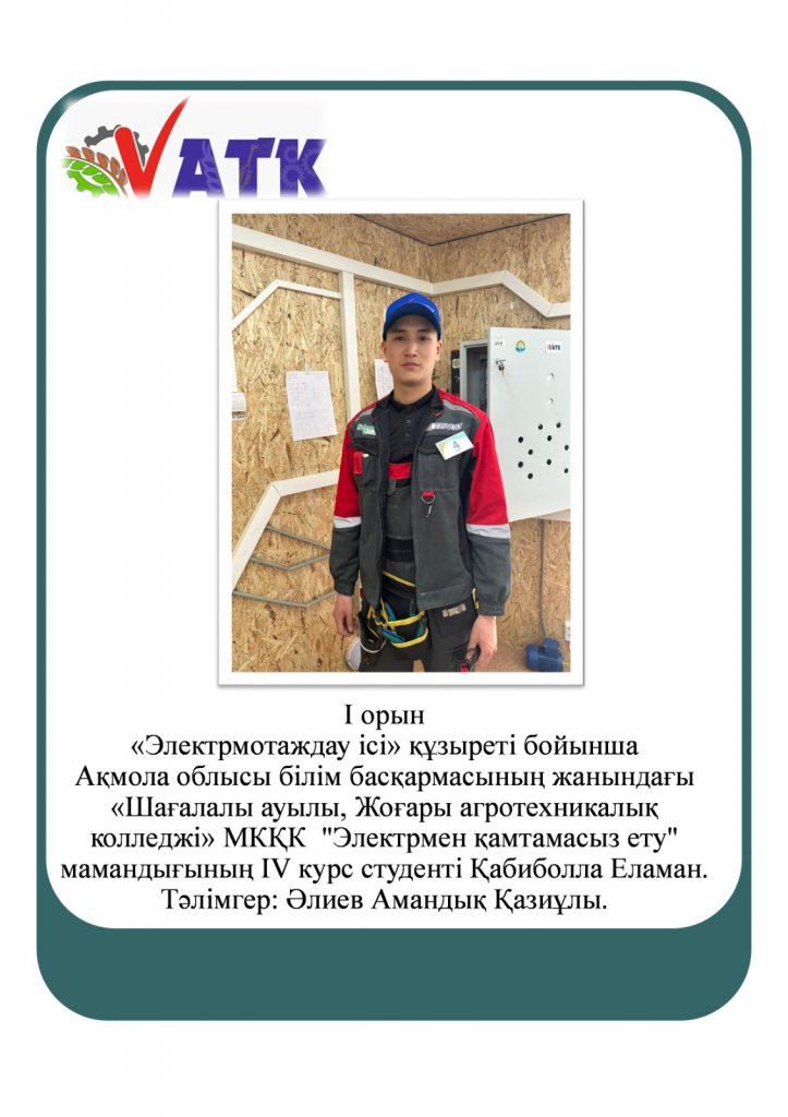 I - место Компетенция "Электромонтажное дело" Қабиболла Еламан Серікұлы студентка ІV курса, специальность ""Электроснабжение" ГККП "Высший агротехнический колледж, с. Чаглинка" при управлении образования Акмолинской области Наставник: Әлиев Амандық Қазиұлы.