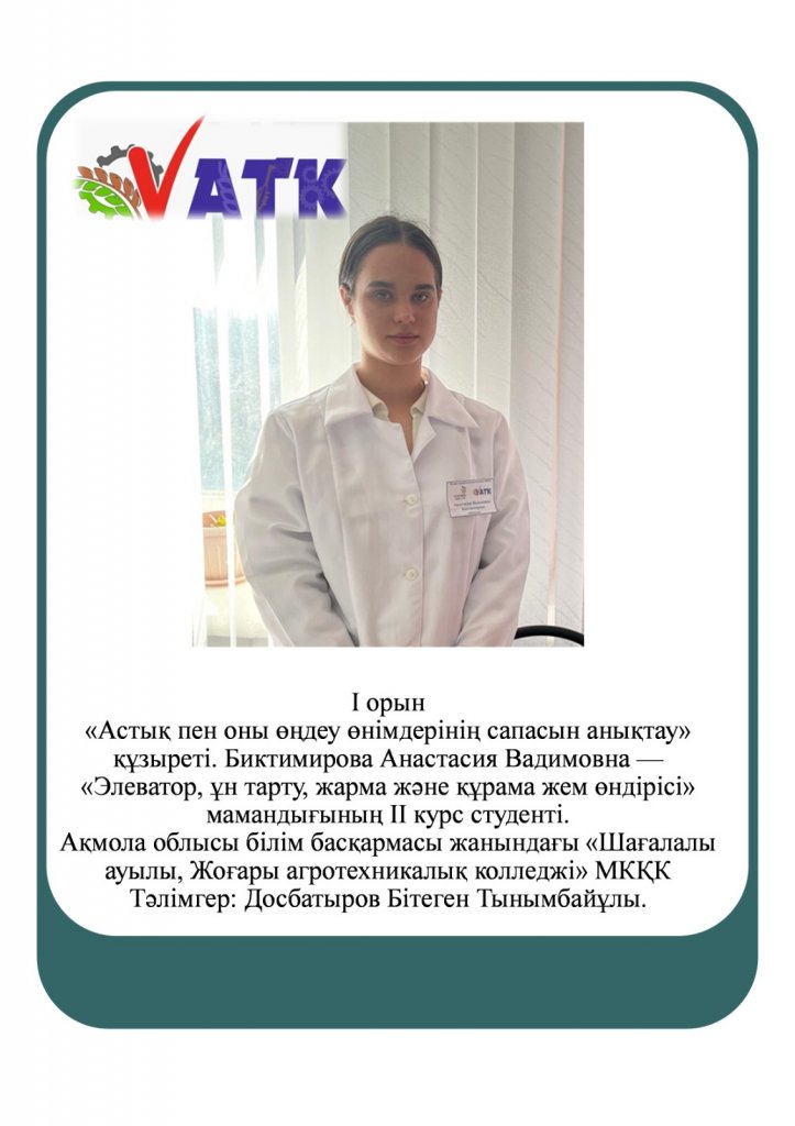 І орын "Астық пен оны өңдеу өнімдерінің сапасын анықтау" құзыреті Биктимирова Анастасия Вадимовна ІІ курс студенті